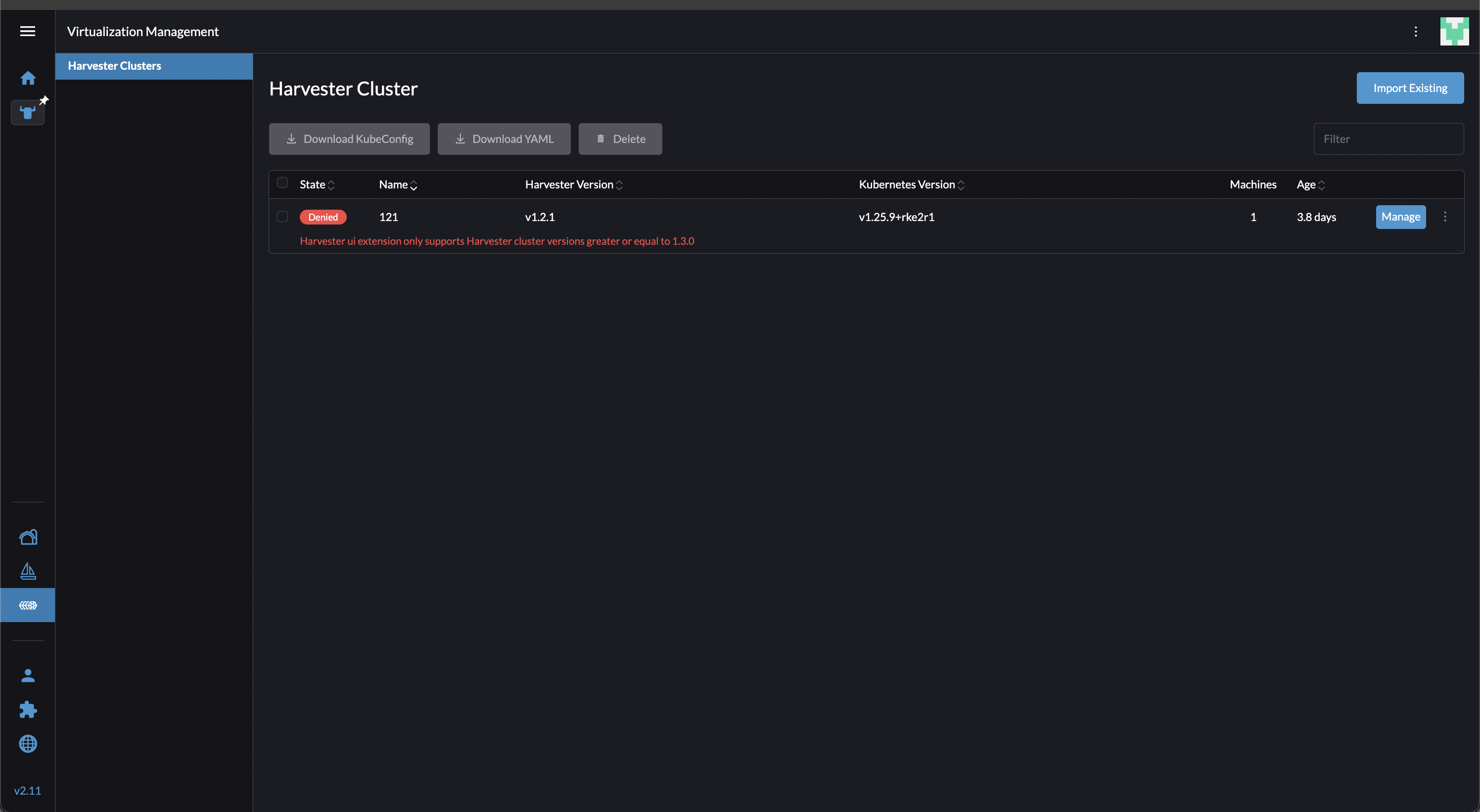 Please avoid clicking Manage button to operate Harvester cluster v1.2.x or earlier, as it is not supported.